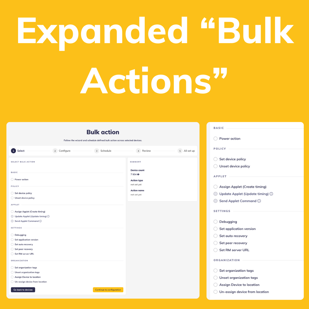 - Bulk Actions: Now, you can send Applet Commands to tens of thousands of devices instantly using “Bulk Actions.”