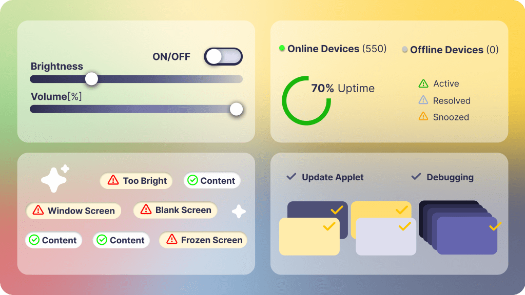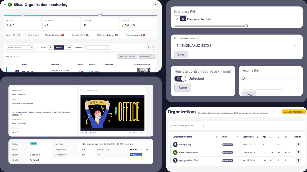 While Google’s Device Management offers robust capabilities, it may not fully address all the specialized needs of the digital signage industry. That’s where signageOS CloudControl steps in. Our platform simplifies the deployment, monitoring, and maintenance of digital signage networks, effectively enhancing Google’s Device Management by integrating essential features specifically designed for digital signage and kiosks.