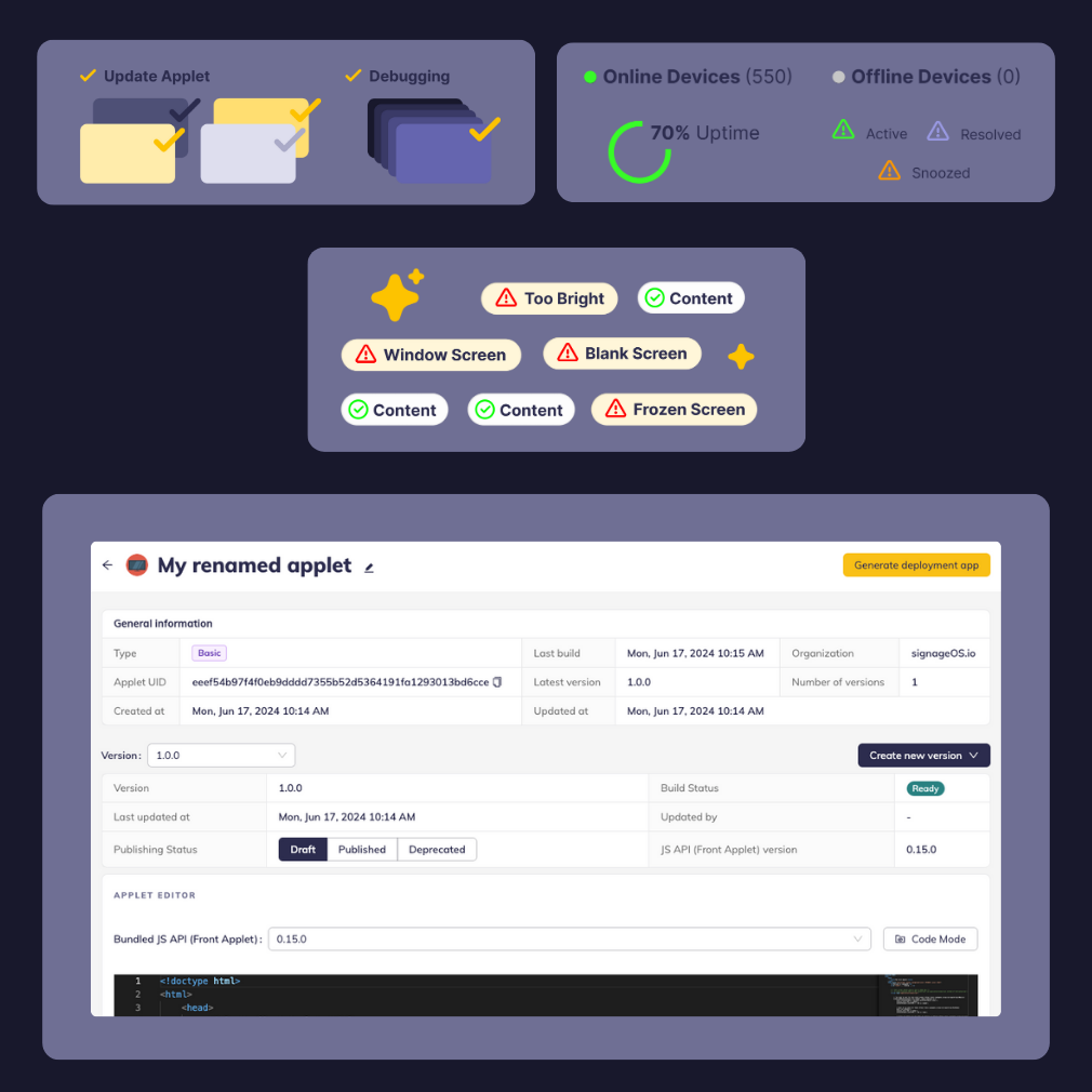 At signageOS, we lead the way in innovation, tirelessly working to deliver a seamless digital signage experience. Our products include CloudControl for efficient device management, Devspace for cross-platform native app development, ProPlayer for Plug & Play functionality, and AI ContentGuard for monitoring and detecting content anomalies. Simplify integration and elevate your digital signage experience