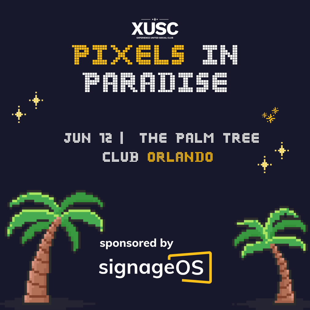 signageOS is excited to sponsor XUSC: Pixels in Paradise, a must-attend digital signage networking event during InfoComm! On June 12 at 6 PM, the Palm Tree Club in Orlando transforms into a retro-inspired escape—bold prints, tropical cocktails, and real conversations with the most creative minds in AV, signage, and experiential design. Dress in your best ‘80s cool meets beachside chill and join us for a night everyone will be talking about.🎈