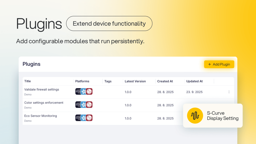 Plugins integrate deeper. Once installed, a Plugin behaves like a native CoreApp feature and can be managed through Policies. It runs automatically and periodically to keep the configuration consistent. For example, a Plugin can enforce a display’s color setting, control connected display configuration with RS232 commands, and appear in Box as a configurable option like any built-in setting.