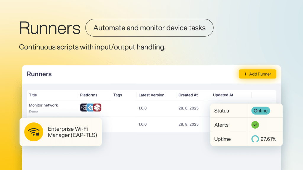 Runners handle continuous operations. They run persistently on the device, monitored by CoreApp for health and uptime. A Runner is useful for complex, always-on logic such as managing enterprise Wi-Fi connections with certificate authentication. It maintains the connection, reports status to Box, and restarts if needed.