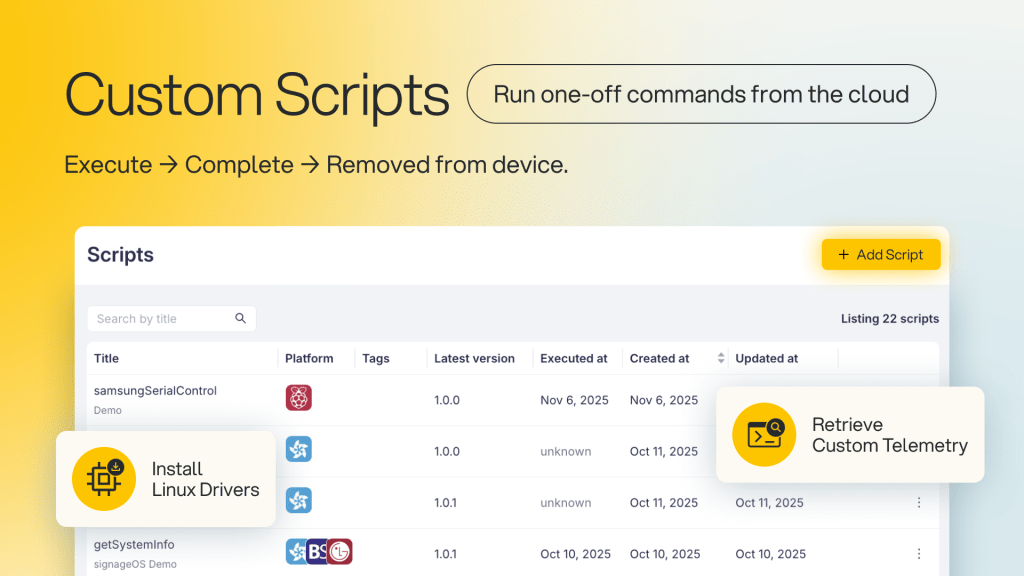 The signageOS platform now provides three ways to extend device functionality and customize behavior: Custom Scripts, Plugins, and Runners. These features help build, customize, and maintain digital signage on a large scale. Whether you are a system integrator, solution developer, OEM partner, or part of an enterprise IT team, these options let you adjust devices to their specific settings, add needed functionality, or simplify complex operational tasks.